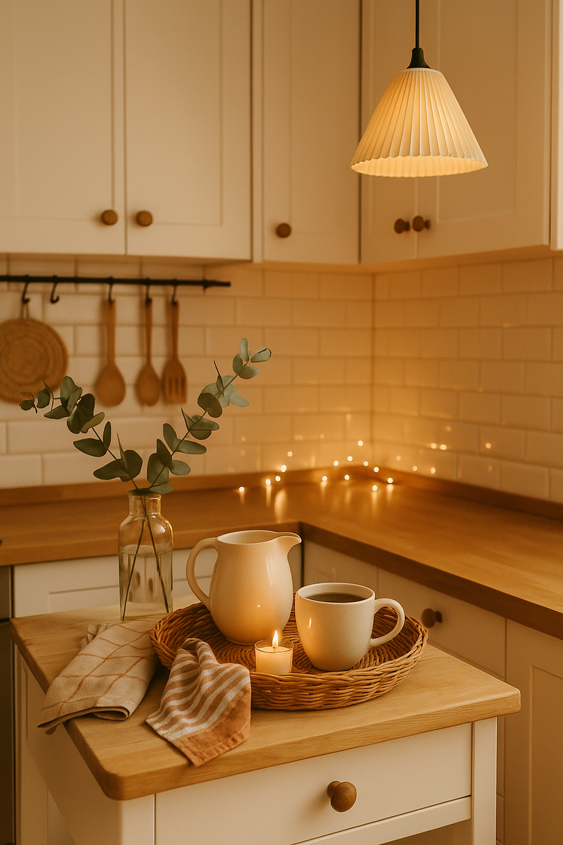 Когда мы переехали в новую квартиру, кухня стала нашей маленькой головной болью. Узкая, тёмная, с уставшими шкафчиками и странным светом — она никак не тянула на «сердце дома». Но именно с неё начался наш путь к уюту. Вот что помогло нам превратить её в место, где теперь пахнет пирогами, смеются по вечерам и приятно находиться. 1. Мы убрали всё лишнее Первым делом мы просто выдохнули и разобрали кухонные полки. Оказалось, половиной посуды мы не пользуемся. Когда исчез лишний хлам, появилось ощущение простора, хотя сама кухня осталась такой же маленькой. Совет: не нужно сразу делать ремонт. Иногда порядок — уже половина уюта. 2. Добавили тёплый свет Мы заменили верхнюю лампу на подвесной светильник с тёплым, мягким светом, а на полку поставили небольшую гирлянду. Это сразу изменило атмосферу — вечера стали теплее, даже ужинать стало приятнее. Совет: свет — это самый недооценённый элемент уюта. 3. Появились «текстильные» мелочи Скатерть из хлопка, набор салфеток, мягкое сид