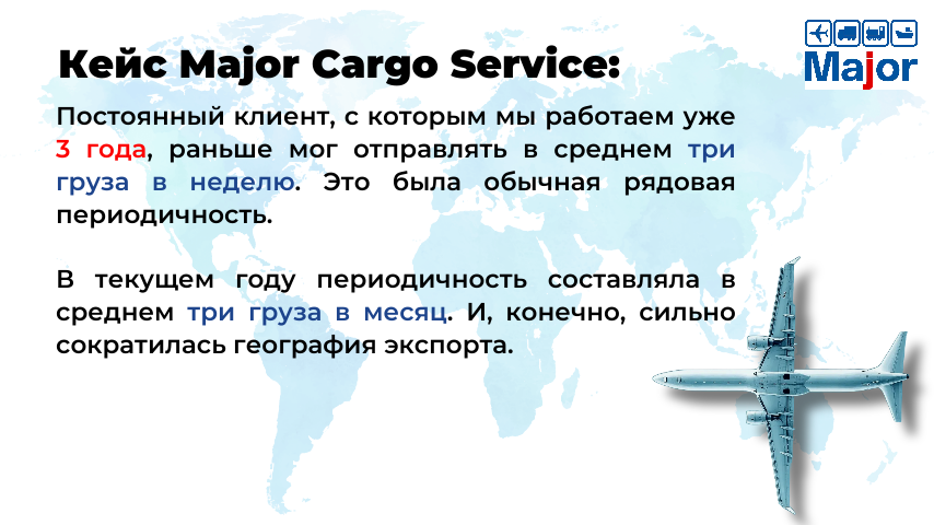 Что касается экспорта, то сейчас мы заключаем два договора с генеральными представителями двух китайских авиакомпаний, чтобы тем самым усилить свои услуги по экспорту из России в Китай на рынке грузовых авиаперевозок. Сейчас у нас есть прямой договор с Аэрофлотом, и это классное подспорье, но китайские авиакомпании готовы предоставить нам очень интересные тарифы, а кроме того, предлагают больший, чем в Аэрофлоте, набор городов прибытия. Аэрофлот сейчас летает в три города: Гуанчжоу, Шанхай и Пекин, но китайские авиакомпании предлагают сетку практически по всему Китаю. Это очень удобно клиентам, которым часто требуется не очень крупный город.