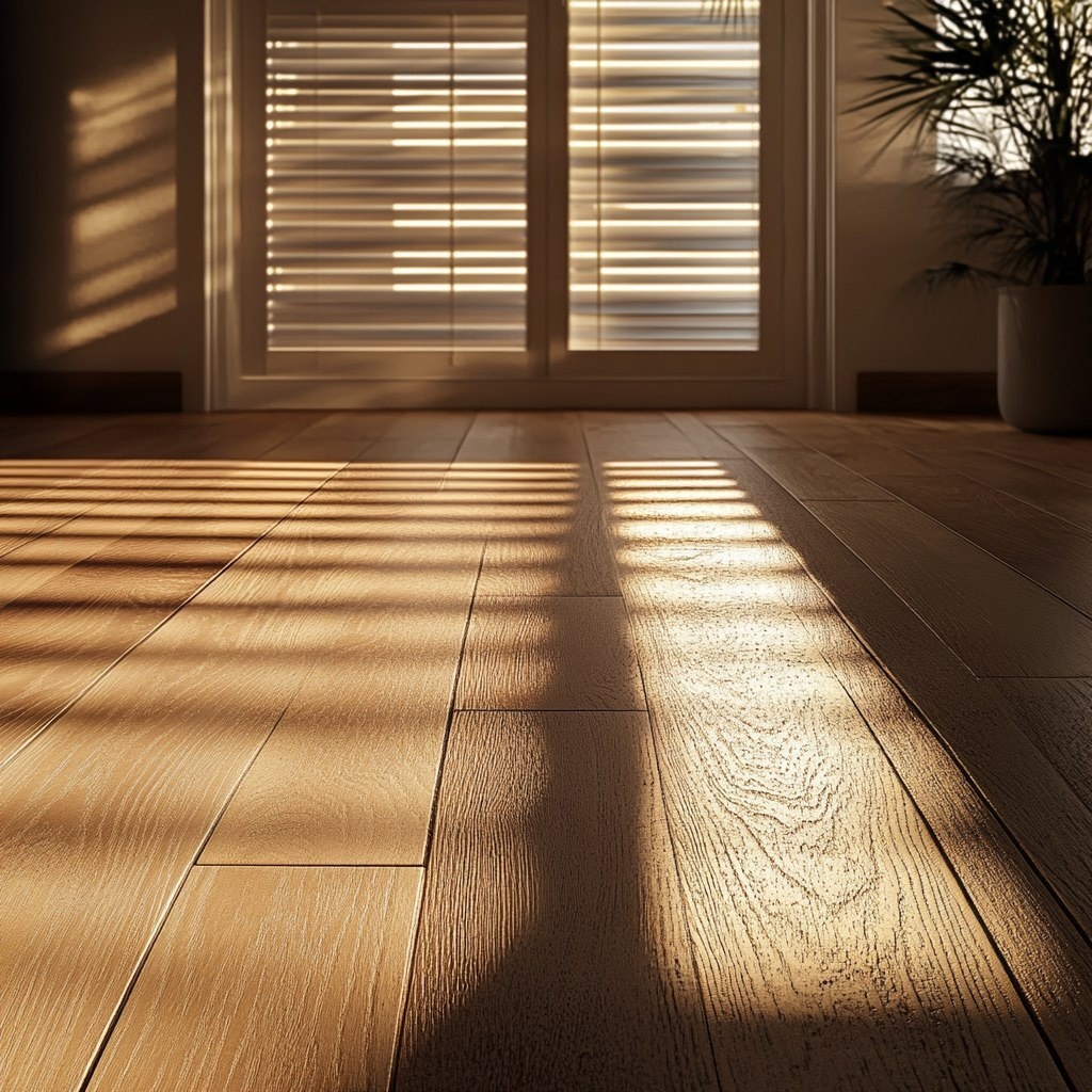 Создано на основе запроса: A luxurious oak floor catching subtle streaks of moonlight filtering through window blinds at night. A calm, almost spiritual scene with shadows playing across the grain, soft glowing edges. Moody, photorealistic, dramatic light and shadow composition.