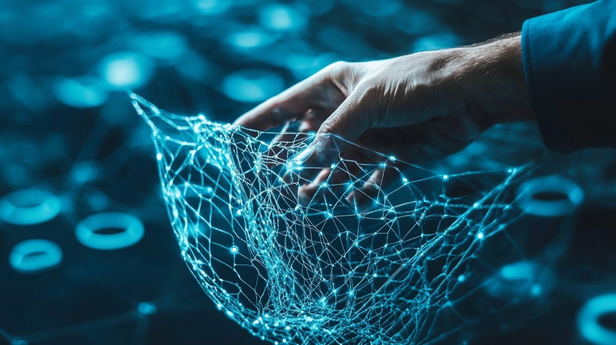 Создано на основе запроса: hand held fishing net A fishing net, catching digital symbols like data graphs, pie charts, bar graphs, blue hues,