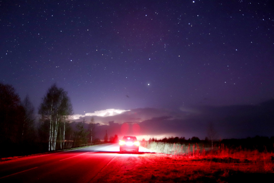 Здравствуйте друзья! Заснял я эту красоту у нас 20.04.2025 в Пасху, хотя приехал на фотоохоту 19.04. К сожалению, как на Севере сияние у нас глазами не видно, но матрица фотоаппарата поглощает много света и всё невидимое становится видимым. Уехал за 20 км от города, хотя надо было дальше, чтобы световое загрязнение не мешало увидеть Млечный путь. Но в ту ночь синоптики обещали дождь и сильную грозу, поэтому далеко ночью не поехал, чтобы если что успеть вернуться домой. Млечный путь не увидел, но красоту заснял. Kodiaq немного попозировал. Включены были только габариты, чтобы редко проезжающие автомобили не снесли меня и машину, а кажется, что и фары включены. На некоторых кадрах видны вспыхи грозы в облаках. Надо сказать, что гроза уже была в примерно пяти километрах от меня и гремело иногда знатно. Даже живность вокруг на какое-то время притихала. Ну да ладно. Кадры сделаны на фотоаппарат Canon 77d в паре с объективом Canon 17-55, f2.8. Выдержки до 20 секунд. Поддержать автора можно
