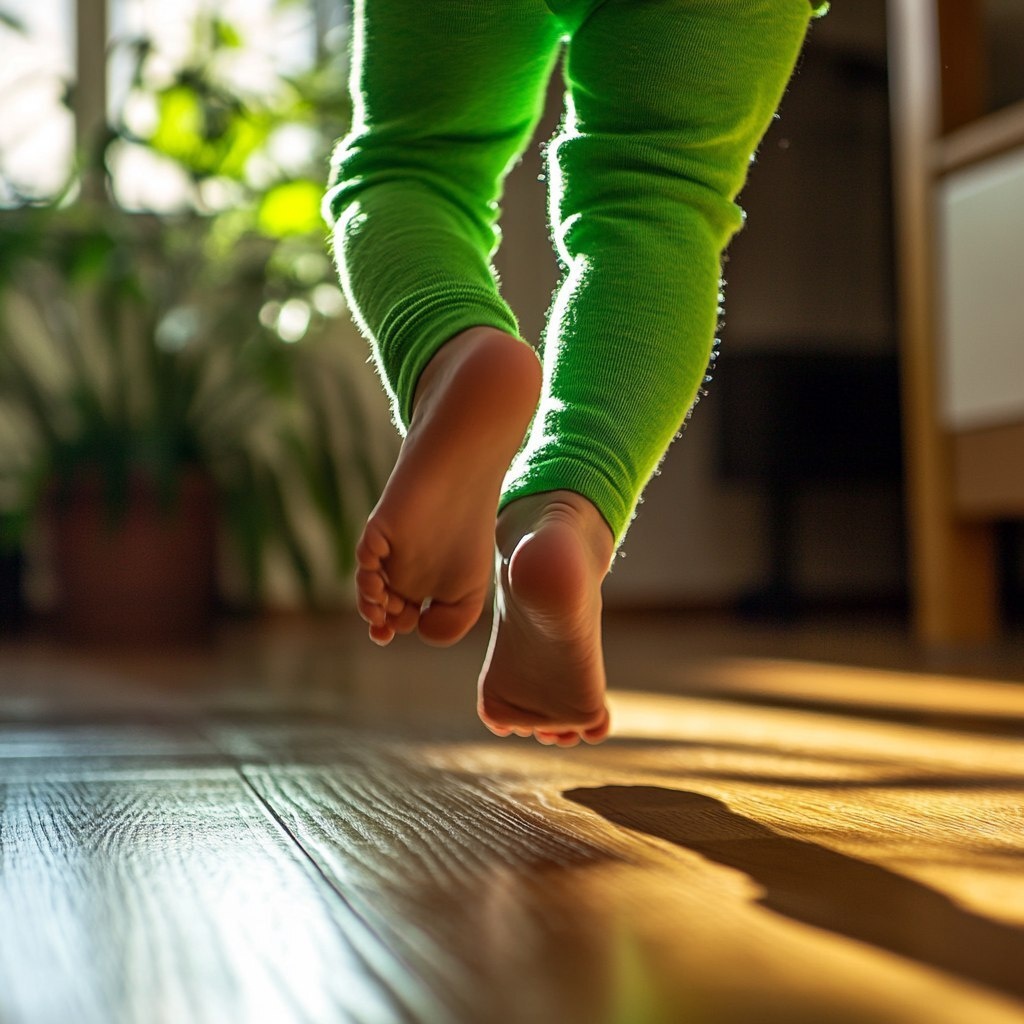 Создано на основе запроса: A child running barefoot across a finished wood floor in bright green socks (#85BD33), caught mid-motion
