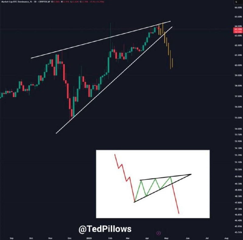 На графике BTC dominance формируется медвежий паттерн — rising wedge