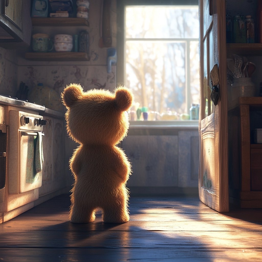 Создано на основе запроса: baby bear cub looking into an empty kitchen, pixar style