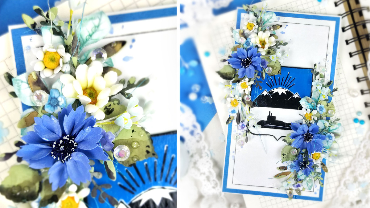 Открытки я делаю и по вдохновению, и на заказ. Часто заказчики просто выбирают что-то конкретное из моих работ и просят сделать подобное, а иногда случаются интересные запросы, с которыми ранее я не встречалась, которых нет в моем портфолио)) Сегодня об одном из таких заказов я вам расскажу. Точнее, я уже начала о нем свой рассказ в предыдущих публикациях, где затронула историю создания декора для воплощения задумки заказчика. В конце этой статьи оставлю ссылки, поэтому заинтересованные смогут подробнее познакомиться с творческим закулисьем. Добавлю пару слов о самом заказе. По запросу нужно было оформить открытку, посвященной городу Гаджиево (Мурманская область), на обложке разместить герб города, а внутри отобразить детский сад. Вот такое интересное ТЗ. А сейчас давайте любоваться результатом проделанной работы. Конкретные цвета не были озвучены, поэтому я отталкивалась от центрального элемента - герба. Основными цветами стали белый и синий, а дополнительными голубой, зеленый, че