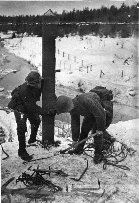 Советские солдаты выкапывают столб на погранзаставе Майнила, 30 ноября 1939 года