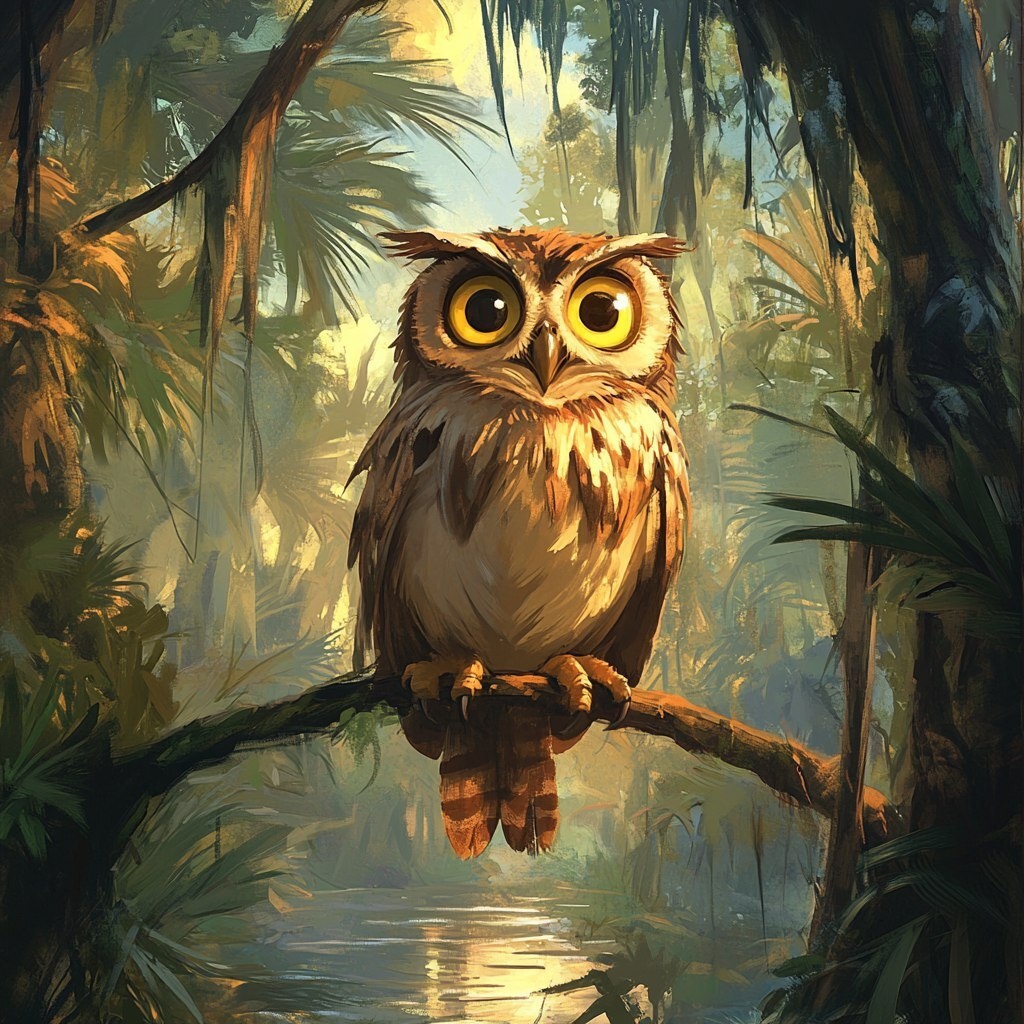 Создано на основе запроса: owl in the trees of the everglades hooting, pixar style