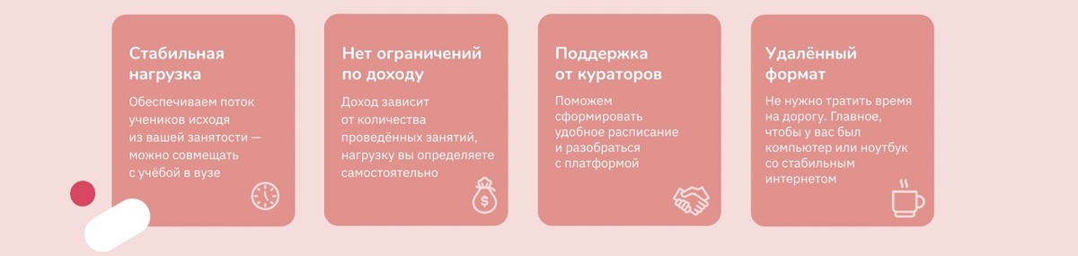 - Возможность самостоятельно определять нагрузку и доход, который зависит от количества проведенных занятий.