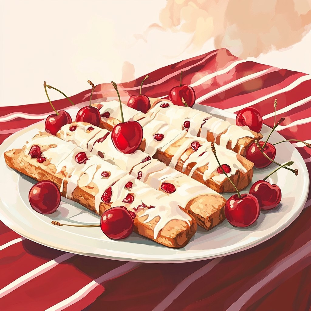 Создано на основе запроса: An illustration of Cherry biscotti and a lot of cherries, cherry with a drizzle of white chocolate on top, cut into multiple pieces and arranged in lines over the platter, against a red-striped kitchen towel background, on a white plate. morning sunlight, good view and a little bit of smoke over biscotti