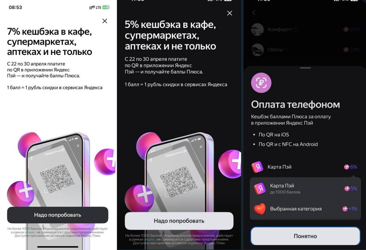 🎉 Яндекс Пэй: до 7% кэшбэка за оплату по QR ⚡️ У части пользователей появилась персональная акция: с 22 по 30 апреля можно получить 5% кэшбэка баллами Плюса при оплате через Яндекс Пэй. 📲 Условия: — iOS: оплата по QR — Android: оплата по QR или через NFC — Макс. кэшбэк — 1 000 баллов за весь период — Баллы тратятся 1 к 1 в сервисах Яндекса (если есть Яндекс Плюс) ♦️ Важно: — Акция не суммируется с другими (кроме выбранной категории) — Доступна только с активной подпиской Плюс — Проверяй наличие баннера в приложении (главная вкладка) ➡️ Как подключить Яндекс Плюс за 1 ₽