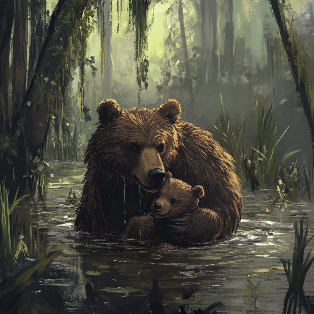 Создано на основе запроса: everglades bear carrying her baby bear in her mouth through the swampy water, pixar style