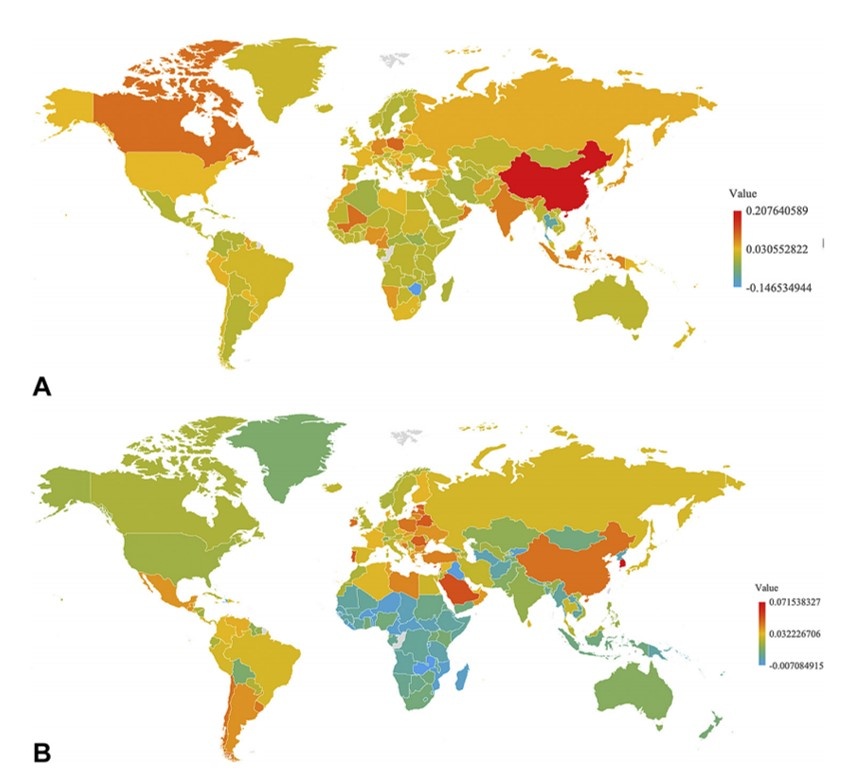 B. Процентные изменения стандартизованного по возрасту показателя распространенности меланомы на 100 000 населения по сравнению с С 1990 по 2017 год. В топ-10 стран с наибольшим приростом вошли: Южная Корея, Ливан, Кипр, Саудовская Аравия, Португалия, Беларусь, Румыния, Эстония, Сингапур и Латвия. В топ-10 стран с наибольшим сокращением вошли: Бурунди, Замбия, Ирак, Буркина-Фасо, Либерия, Гвинея-Бисау, Нигер, Мозамбик, Камерун и Кыргызстан.