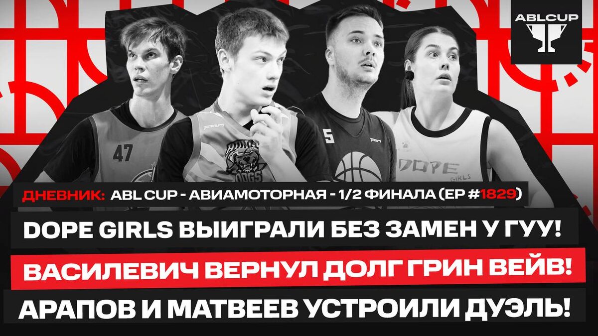 😏ДНЕВНИК - ABL CUP - АВИАМОТОРНАЯ - 1/2 финала (1829 выпуск) 🌟Dope Girls выиграли без замен у ГУУ! ➕Василевич вернул долг Грин Вейв! 😎Арапов и Матвеев устроили дуэль! 🤺 17:00 🕟 https://vkvideo.ru/video-154666590_456246523