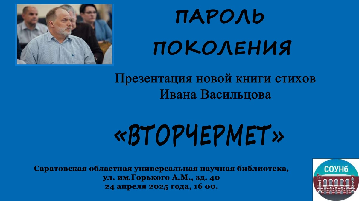 Библиотека приглашает на презентацию новой книги стихов Ивана Владимировича Пыркова (Иван Васильцов) «Вторчермет», ставшей заметным событием в литературной жизни. На презентации поэт расскажет о значении для него книги «Вторчермет», прочитает стихи из сборника и ответит на вопросы. У любителей поэзии будет возможность лично познакомиться с творчеством известного саратовского поэта и составить собственное мнение о его произведениях. Об авторе: 📚Иван Владимирович Пырков (Иван Васильцов) – поэт, прозаик, эссеист, историк русской литературы, доктор филологических наук, профессор Саратовской государственной юридической академии. Лауреат престижных литературных премий, включая Международную литературную премию имени И. А. Гончарова, Литературную премию Саратовской области имени М. Н. Алексеева, премию Российского общества «Знание» «Просветитель года». 🗓 24 Апреля ⏰ 16:00 📍Областная универсальная научная библиотека ул. им. Горького А. М., зд. 40 Вход свободный