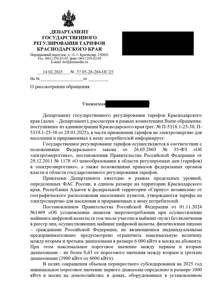 С 2025 года в Российской Федерации введены диапазоны потребления электроэнергии на потребителей категории населения и приравненных к ним. Диапазоны определяют величину стоимость электроэнергии от величины ежемесячного потребления электроэнергии. Всего три диапазона (первый, второй и третий). Чем выше диапазон, тем дороже электроэнергия для потребителя. Объемы и стоимость электроэнергии в каждом диапазоне зависят от разных факторов, в том числе от наличия электрообогрева и электронагревательных установок у потребителя. В Краснодарском крае определились какие документы необходимо представить, чтобы потребитель категории населения и приравненный к ним, мог рассчитывать на применение диапазона потребления для электрообогрева и электронагревательных установок (для частным жилых домов). Фото документов прикладываю. Такими документами, по мнению регулирующего органа, являются документы, свидетельствующие о направлении использования электрической энергии в целях отопления и приготовления пищи