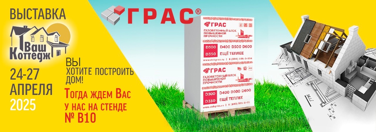 В период с 24 по 27 апреля 2025 года в Самаре состоится XVII Межрегиональная специализированная выставка «Ваш Коттедж. Малоэтажное и коттеджное строительство». Более 100 крупнейших строительных и производственных компаний со всей России соберутся в выставочном центре «Экспо-Волга», в числе которых современный завод по производству автоклавного ячеистого газобетона ДСК «ГРАС-Саратов». Стенд предприятия «ГРАС» будет расположен возле главной сцены: место № В10 Выставка пройдет с 24 по 27 апреля 2025 года по адресу: г. Самара, ул. Мичурина, 23А. Время работы выставки: 24, 25 и 26 апреля с 10:00 до 18:00 часов. 27 апреля с 10:00 до 16:00 часов. Вход на территорию выставки – БЕСПЛАТНЫЙ. Не упустите возможность посетить выставку и узнать больше о современных технологиях и материалах в сфере малоэтажного и коттеджного строительства! Приходите, будем рады видеть Вас!