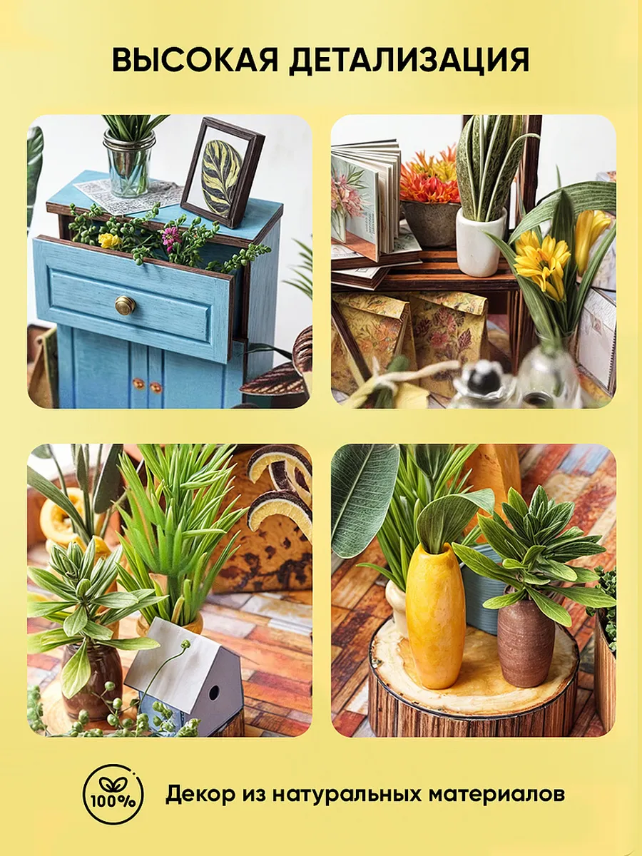 Берите в руки румбокс, когда грустно или скучно. Маленький домик перенесет вас в другой. Он размером с книгу и внутри него развивается целая история со своими деталями. В румбокс-оранжерее можно собирать пазл из маленьких деталей. Он работает как терапия: снимает стресс и расслабляет мысли. Ребенок соберет всё это из маленьких деталек. Похоже на лего, но вместо конструктора — эстетичная модель мира. Румбокс — это конструктор из множества красивых деталей. Подросток создает сценарий сам. У него в руках мини-версии рабочего стола, лампы, книжных полок, цветов. Это развивает внимание, терпение и фантазию. Особенно, когда надо приклеить крошечную чашку так, чтобы она не упала. Как часто вы ловите себя на том, что листаете телефон просто так? А дети залипают в экран еще чаще. Отвлечь их от экрана — квест со звездочкой. Румбокс привлекает внимание и умеет его удержать. Он выглядит стильно. Помогает сконцентрироваться на сборке. И параллельно подросток может слушать люби
