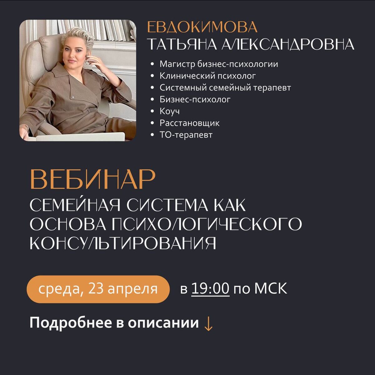 Уже сегодня! Бесплатный вебинар: как семейные корни влияют на проблемы ваших клиентов 💡 ❓ Ваш клиент снова и снова сталкивается с похожими трудностями? Например, не может наладить отношения с близкими или постоянно испытывает тревогу. Вы работаете с ним, но проблема словно возвращается. Почему так происходит? Ответ часто скрыт глубже — в семейной системе, её ролях, правилах и динамике. Чтобы помочь клиенту по-настоящему, важно научиться видеть эту систему и её влияние. 🀄️ Сегодня в 19:00 (МСК) приглашаем вас на бесплатный вебинар «Семейные корни проблем: как системный подход помогает в работе психолога». Что обсудим? ⏺ Как семья влияет на жизнь и поведение человека. ⏺ Основы системного подхода в психологии. ⏺ Практические инструменты для анализа семейной динамики. ⏺ Реальные примеры из практики. Для кого? ⏺ Психологов — чтобы работать глубже и эффективнее. ⏺ Студентов — для изучения системного подхода. ⏺ Всех, кто хочет лучше понимать свои отношения с близкими. Ссылка на веби