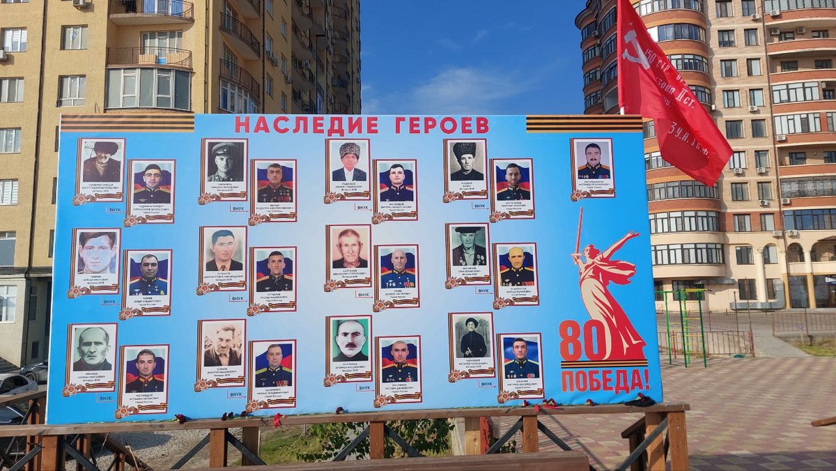 Уллу Ватан давну 80 йыллыгъына багъышлангъан баннерлер шагьарланы ва юртланы безеп тура. Магьачкъалада шулай "Игитлени наслулары" деген бир баннерде 2 къумукъ Россияны Иигити оьзлени уллаталары булан салынгъан.