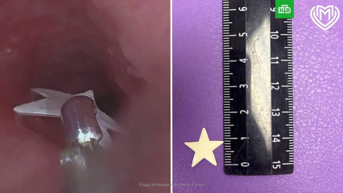 В детскую больницу им. Сперанского доставили годовалого малыша. По словам родителей, он подавился яблоком, стал кашлять, задыхаться и синеть. Во время осмотра врачи обнаружили в его пищеводе наклейку-звездочку.