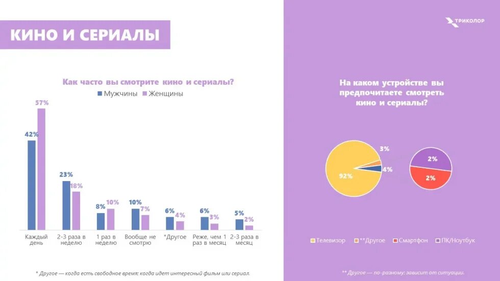 По данным опроса, 57 % женщин смотрят кино или сериалы каждый день, среди мужчин этот показатель составляет 42 %. Чуть реже, 2-3 раза в неделю, такой контент включают 23 % мужчин и 18 % женщин; раз в неделю — 8 % и 10 % соответственно; 2-3 раза в месяц — 5 % и 2 %; реже, чем раз в месяц — 6 % и 3 %. Вообще не смотрят кино и сериалы 10 % мужчин и 7 % женщин, на свое свободное время ориентируются 6 % и 4 % соответственно.