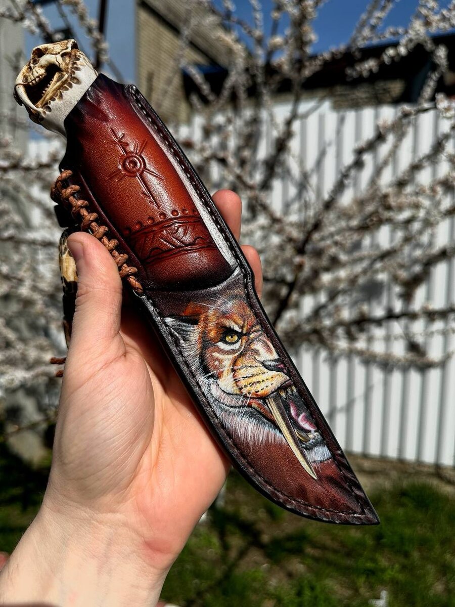 В комплекте идут ножны с авторским рисунком смилодоны и тиснение.