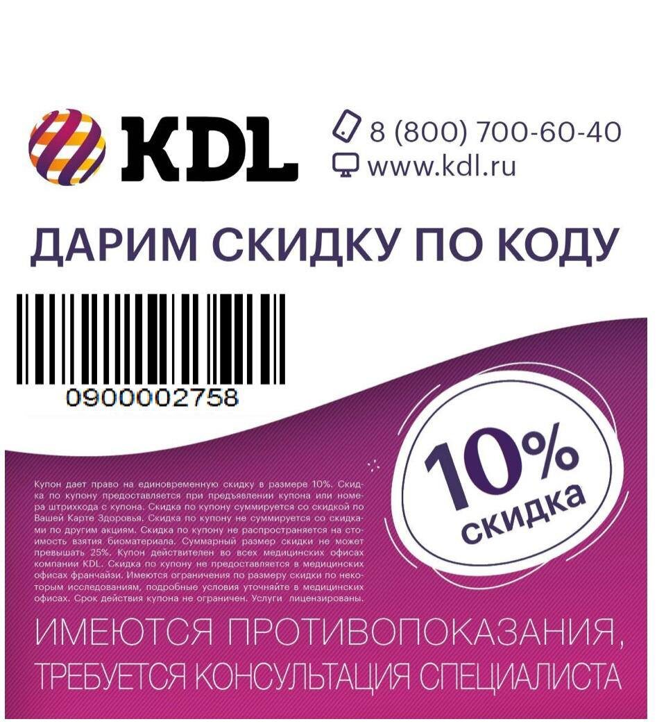 Дорогие, у меня для вас отличная новость ! 🛍 Я оформила скидочный купон на сдачу анализов в лаборатории KDL. Теперь для вас будет действовать максимальная скидка - 10%. Так как скидка, максимальна, то для меня выплаты не предусмотрены. Поэтому если я рекомендую сдавать в КДЛ, это значит что там для вас выгодно. Я с этого ничего не имею. 📍Купон действителен на всей территории России. Поэтому обязательно сохраняйте, чтоб Вы могли предоставить его при сдачи анализов и получить скидку.