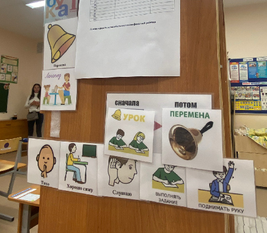 В классе на доске висит визуальное расписание с днями недели и соответствующими уроками. Для каждого отдельного урока при необходимости для ученика выстраивается индивидуальное ВР из карточек: звонок на урок, слушаем учителя, смотрим на доску, пишем в тетради, поднимаем руку, чтобы ответить, отвечаем у доски, звонок с урока.