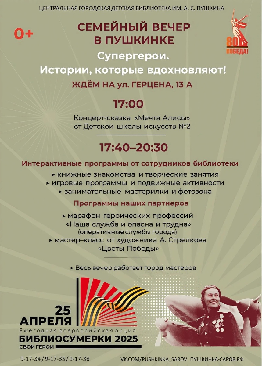 ↗ Пушкинка приглашает саровчан на Библиосумерки 25 апреля жителей города ждет насыщенная программа с концертами, творческими занятиями, играми и мастер-классами. Начало в 17:00. Вход свободный. 0+