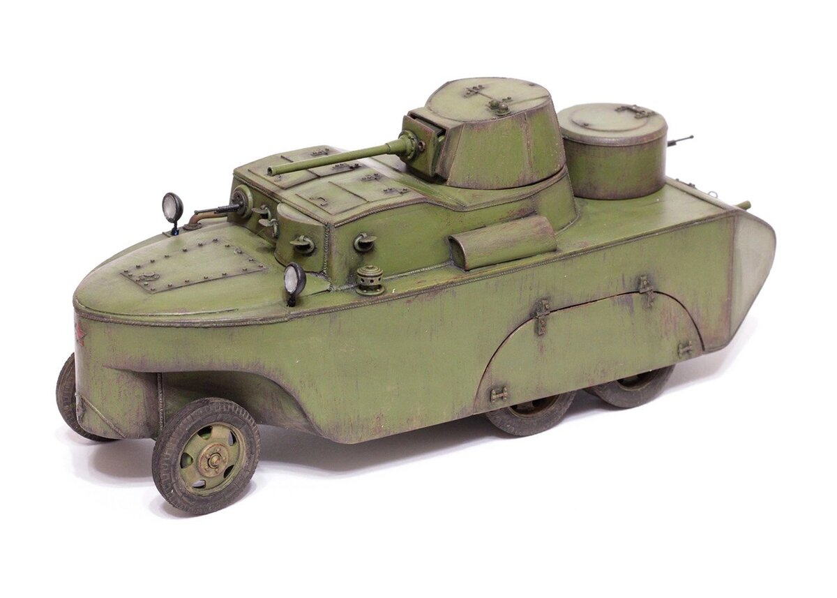 БАД-2 Автор: Чу_жой Самодел, 1:35 ================================ От автора: "Предварительная подготовка проекта изначально находилась в ведении ОГПУ – в начале 1932 года начальник отдела Медведев передал на ленинградский завод “Большевик” проектную документацию, где бригада инженеров под руководством Н.Обухова приступила к доработке и изготовлению опытного образца. Конструкция бронеавтомобиля была во многом оригинальна. Корпус БАД-2 крепился к раме ходовой части при помощи сварки и болтов был выполнен в форме лодки. Задние сдвоенные колеса были закрыты большим бронещитом изогнутой формы, который начинался в передней части и плавно огибал носовое колесо. Над корпусом сделали небольшую коробкообразную надстройку. Для передвижения на плаву машина снабжалась трехлопастным гребным винтом, установленном на конце червяка передачи заднего моста. Это несколько упростило конструкцию, но в результате на плаву вращались задние колёса, а при движении по шоссе вращался винт. Так как киль на Б
