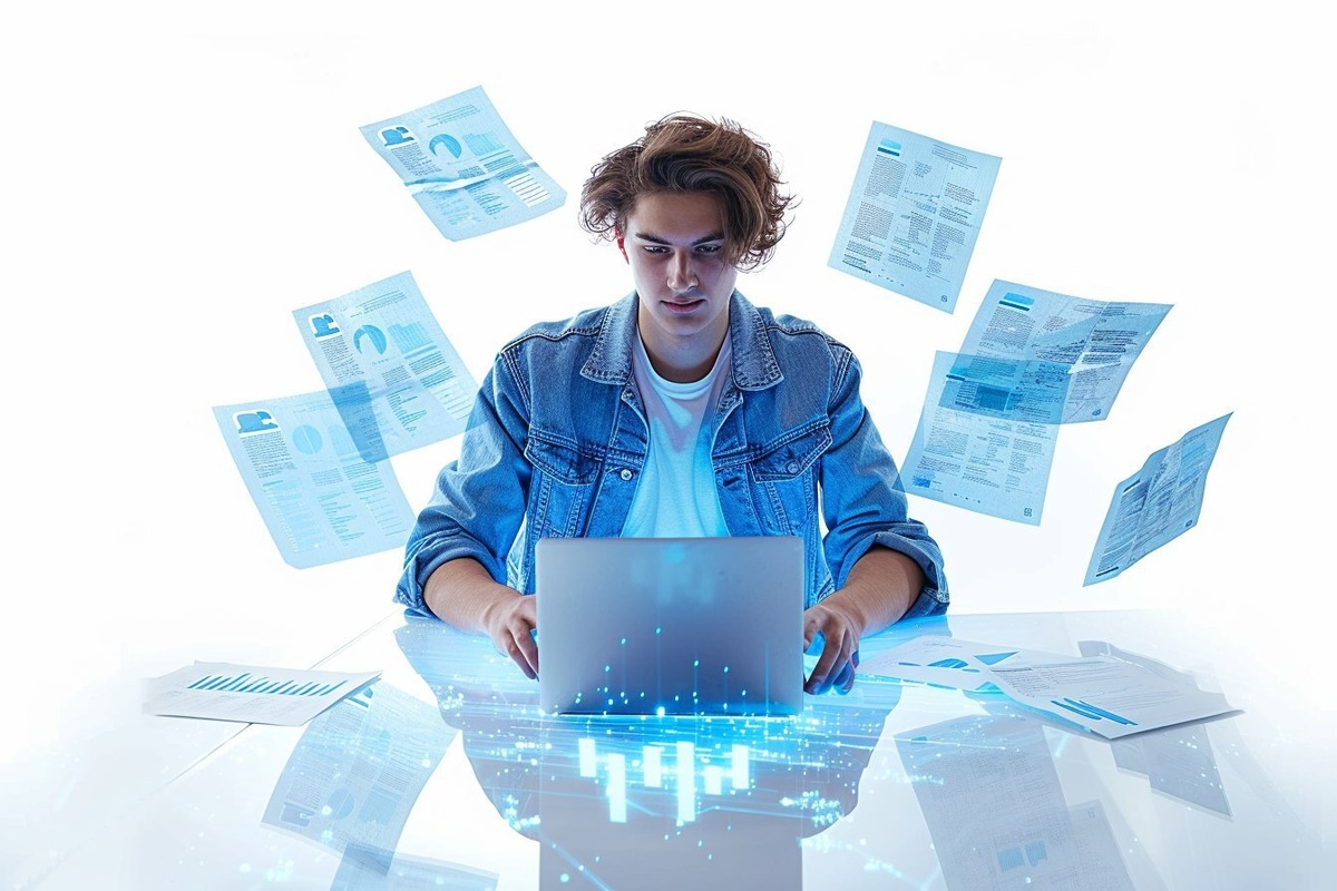 Создано на основе запроса: front view of a naturally happy young man working on a futuristic laptop, glowing blue digital documents floating