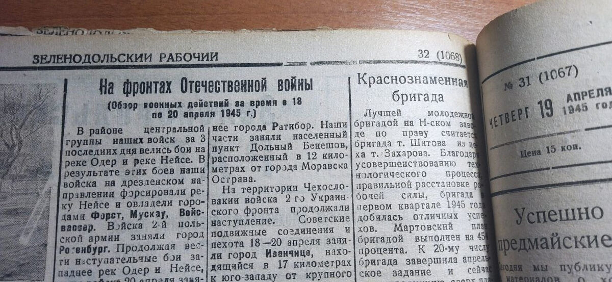 До празднования юбилея Победы остались считанные недели. Рассказываем о том, чем и как жил Зеленодольск и горожане в последние дни Великой Отечественной войны. А помогут нам в этом архивные подшивки газеты «Зеленодольский рабочий» за 1945-й год. Лучшей молодёжной бригадой на Н-ском заводе (завод им. Серго — прим. ред.) по праву считается бригада тов. Шитова из цеха тов. Захарова. Благодаря усовершенствованию технологического процесса, правильной расстановке рабочей силы, бригада в первом квартале 1945 года добилась отличных успехов. Мартовский план бригадой выполнен на 454%. К 20-му числу бригада завершила апрельское задание и сейчас даёт продукцию сверх плана. Членами бригады внесены два рационализаторских предложения, которые дали заводу 30 тысяч рублей экономии. Для тракторного парка республики бригада вместо восьми головок блока по плану — ежедневно выдаёт 25 штук. Сам тов. Шитов систематически выполняет задание на 450-480%. Члены бригады тов. Коробков и тов. Хапугин ежедневно дают