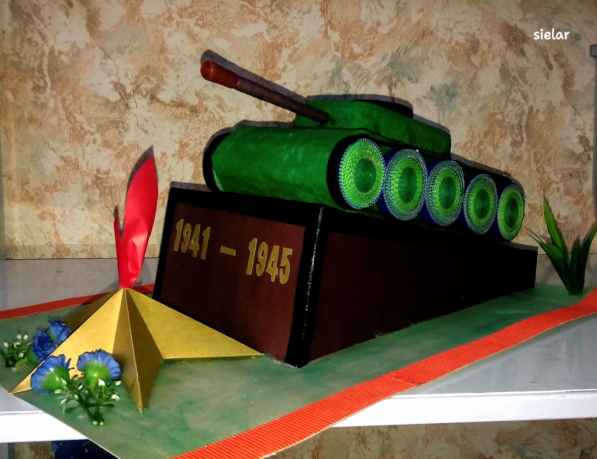 Всем привет! В преддверии Дня Победы, праздника, символизирующего героизм и самоотверженность нашего народа, хочется создать что-то особенное, проникнутое духом памяти и благодарности. Предлагаю вашему вниманию мастер-класс по изготовлению танка – символа мощи и непобедимости – из простых и доступных материалов. Основой нашей поделки станет обычная коробка от детской каши. Её мы тщательно обклеили гофрированной бумагой, придавая будущему танку фактурность и объем. Гусеницы, выполнили в технике квиллинг из гофрокартона. Пушка танка – это обычный фломастер, ставший в наших руках оружием мира и памяти. Его мы обернули цветной бумагой. Вечный огонь, вырезали из красного картона. Он будет напоминать о бессмертном подвиге героев, отдавших свои жизни за наше будущее. Вокруг цветы - символ благодарности и уважения к ветеранам, к тем, кто ковал победу на фронте и в тылу. Основа поделки – лист зеленого картона, символизирующий мирную землю, завоеванную ценой огромных потерь. Башню танка, сд
