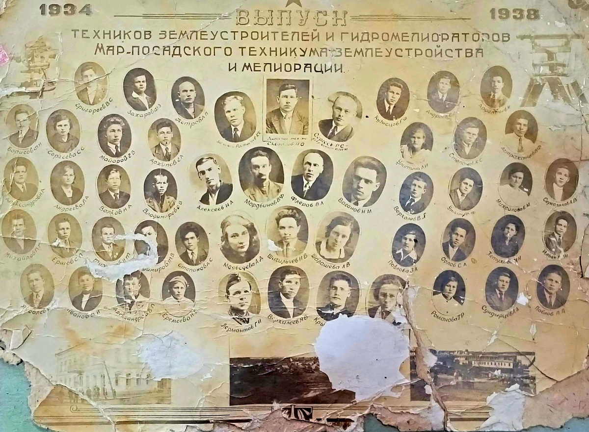 Народный комиссариат земледелия РСФСР. Мариинско-Посадский техникум землеустройства и мелиорации. Выпуск техников землеустроителей и гидромелиораторов. 1934- 1938 годы. Скворцов И.О., директор техникума. Р…цов К.К., заведующий по учебной части. Сергеев Р.С., секретарь комитета ВЛКСМ. Преподаватели. Алексеев И.А. Мордвинов В.Ф. Флёров В.Л. Вагонов Н.М. Медведева А.Д. Шигильчев И.В. Шалашева Л.В. Лермонтов Г.И. Верхилеев Я.В. Кры… … Выпускники. Григорьев В.С. Захаров Ф.З. Петров А.П. Борисов Ф.Н. Сергеева С.С. Майоров Г.В. Архипов Г.А. Александров Н.А. Андреева Л.А. Волков Н.А. Владимиров О.В. Михайлов П.М. Ершов С.П. Тихонов И.Т. …димиров Т.В. Степанов А.С. Яковлев … Иванов О.И. Александров В.Л. Еремеева Н.Е. Кузнецов Г.Ф. Андреев С. Арсентьев В.М. Улитина А.И. Степанов К.С. Астраханцев В.Ф. Верхолев В.П. Уткин Ф.Ф. Михайлова Е.М. Сероволков А.В. Павлова З.А. Орлов С.А. Петухов И.Н. Ильин …Н. Романова Т.Р. Сундырцев А.А. Павлов П.П.