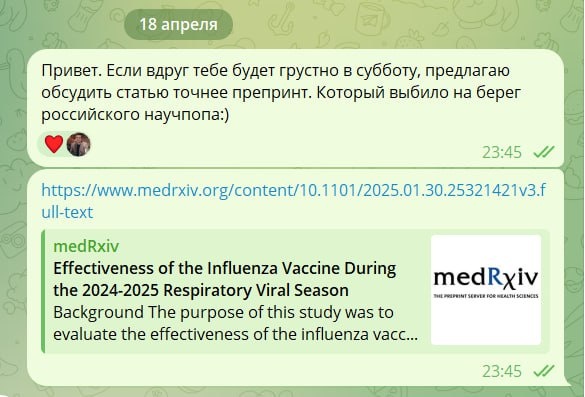 😈 Вакцина от гриппа показала отрицательную эффективность! Наконец-то раскрыта правда! Или нет? За прошлую неделю несколько человек скинули мне ссылку на некое сенсационное исследование, которое их сильно смутило. Основной вывод статьи был в том, что вакцина от гриппа обладает отрицательной эффективностью! Звучит действительно тревожно. Разберемся, в чем же дело? Беглого взгляда оказалось достаточно, чтобы понять, что у статьи есть серьезные проблемы с дизайном (то есть с тем, как оно было спланировано), а значит доверять выводам безоговорочно будет неправильно. Но, чтобы быть максимально объективной, я обратилась за вторым мнением к беспристрастной стороне: к уже ранее упоминавшемуся мной Даниилу Мунблиту, который собаку съел на научных исследованиях в медицине, а сейчас ведёт об этом небольшой телеграм-канал. В итоге в пятницу вечером за 15 минут до полуночи меня погрузили в удивительный мир анализа данных и баисов. Не перестаю удивляться, какие дурные выводы можно получить, есл