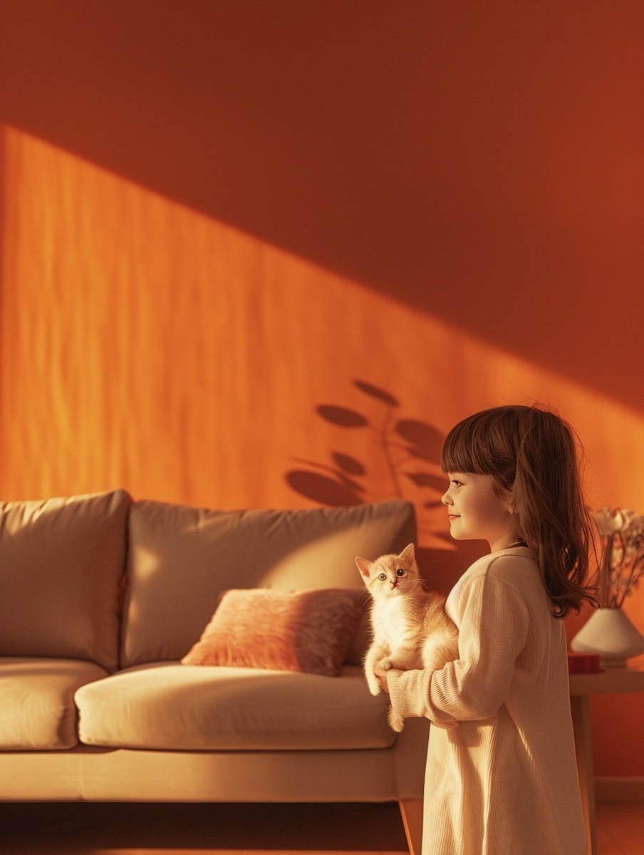 Создано на основе запроса: spacious wooden floor with ample empty space in the foreground for product placement, beautiful iridescent orange wall with soft gradients, cozy modern sofa, small coffee table with a vase of flowers, warm ambient lighting, non-realistic, AI-inspired digital interior design; a 7-year-old girl standing slightly off-center, gently holding a small kitten in her arms, soft expression, light clothing, harmonious color palette --- Автоперевод: Просторный деревянный пол с достаточным пустым пространством на переднем плане для размещения продуктов, красивая радужная апельсиновая стена с мягкими градиентами, уютный современный диван, маленький журнальный столик с вазой цветов, теплое окружающее освещение, нереалистичный, вдохновленный AIS-дизайн интерьера; Как тебе эта картинка? 🤔 https://dzen.ru/id/65c0c65c86e4f837c27b24d7 #ИИ #AI #нейросеть #midjourney #art