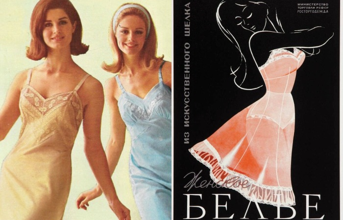 Ведь даже если хлопковая или сатиновая отечественная комбинация дополнялась вполне себе презентабельным кружевом, оно, как правило, жутко кололось. Импортные шелковые модели завозили чаще неофициально, так что заполучить эксклюзив приравнивалось к мечте. Счастливые обладательницы не упускали возможности продемонстрировать узнаваемый нижний подол, невзначай поправляя юбку или одергивая платье.