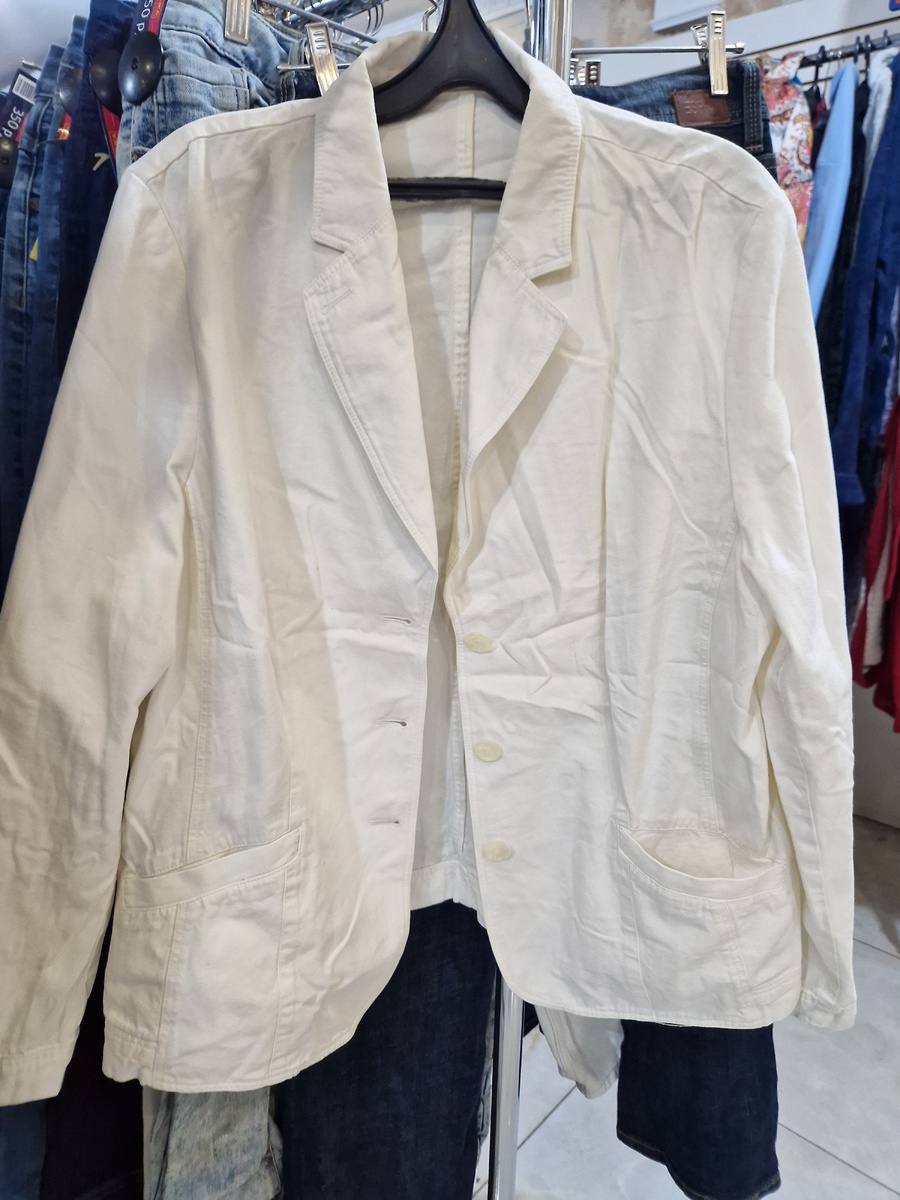 Первое, за что зацепился взгляд, был вот такой хлопковый пиджак. Он был предложен моей родственнице, которая была на телефоне и мгновенно отреагировала согласием. Пара фото с примеркой - и грядущая покупка одобрена👌🏽
