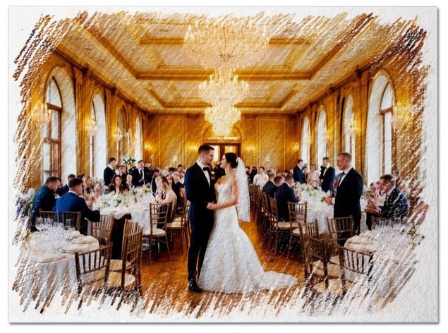 Гости, нарядные и улыбчивые, наполняют зал живыми разговорами и смехом. Женщины в коктейльных и вечерних платьях, а мужчины в костюмах, выглядят стильно и сдержанно. Они обмениваются поздравлениями, поднимают бокалы за здоровье молодоженов. Атмосфера наполнена энергией любви и счастья».