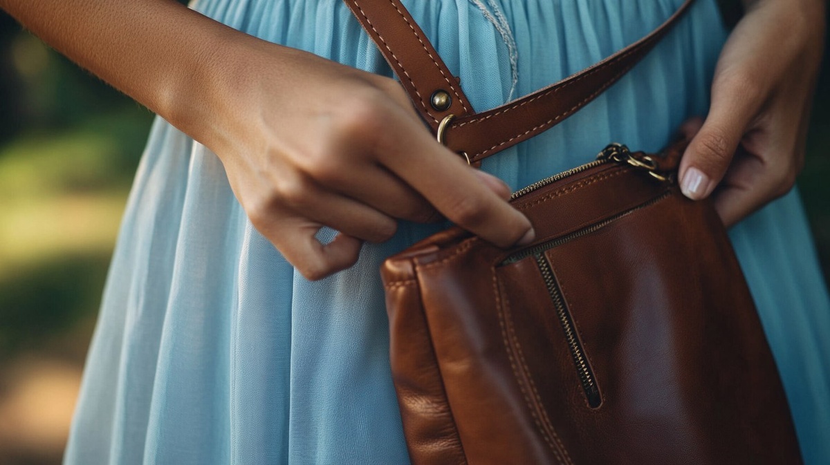 Создано на основе запроса: extreme close up latin woman wearing pale blue dress, hands opening zip on brown leather bag , sunny day, real