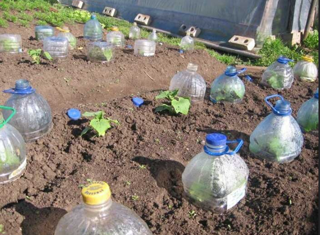 Через неделю после посева я проверяю грядку. Как только появляются всходы, откручиваю крышки у бутылок на день и немного приоткрываю пленку по краям. При необходимости поливаю растения теплой водой вокруг бутылок. Когда растения начнут испытывать недостаток места, снимаю бутылки, а спанбонд и пленку оставляю на дугах.
