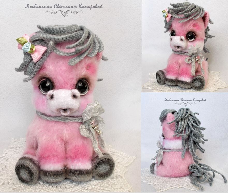 15см. Без крепежей. Оформление срене-подробное+фото. мк-200р Материалы: - нитки Камтекс хлопок травка(кхт)розовый,белый +крючок 1,5мм -нитки Пехорка Детский каприз(дк) для копыт-серый/беж/коричневый 225м/50гр -глаза -полубусины цветные 13мм/если чёрные меньше,белый шнур (нижнее веко)розовый(верхнее) -наполнитель -тонировка масляная пастель коричневая, красная, чёрная и чёрный маркер -секундный клей, липучка,картон,ножницы