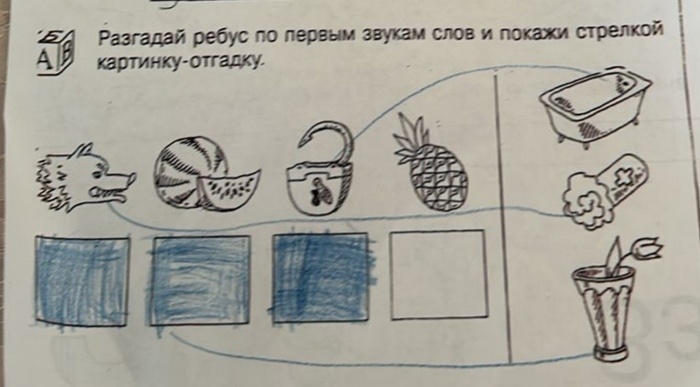 Буквально на днях получила живой пример шизофренического мышления. Подруга, состоящая в мамчате, поделилась прекрасным. Детям в рамках подготовки к школе раздали простенькие задания. Нужно решить ребус: вписать в квадратики первые буквы слова с каждой картинки и полученное слово соединить с соответствующей картинкой. Из первых букв изображений волка, арбуза, замка и ананаса получается слово "ваза", соответственно, нужно с вазой и соединить. Казалось бы, что может пойти не так? Но, одна из мам, выполняя задания с ребёнком, решила его вот таким образом (см. картинку ниже). Когда её начали спрашивать, зачем квадратики окрашены в синий, она пояснила, что это потому, что слова начинаются с согласных букв (хз, причём тут это). А когда попросили пояснить, почему картинки соединены друг с другом, она выдала: - Я рассуждала ЛОГИЧЕСКИ: вот волк, у него зубы, то есть стоматология, то есть медицина, значит можно соединить с ватой, так как она тоже в медицине используется. В арбузе жидкость, в вазе