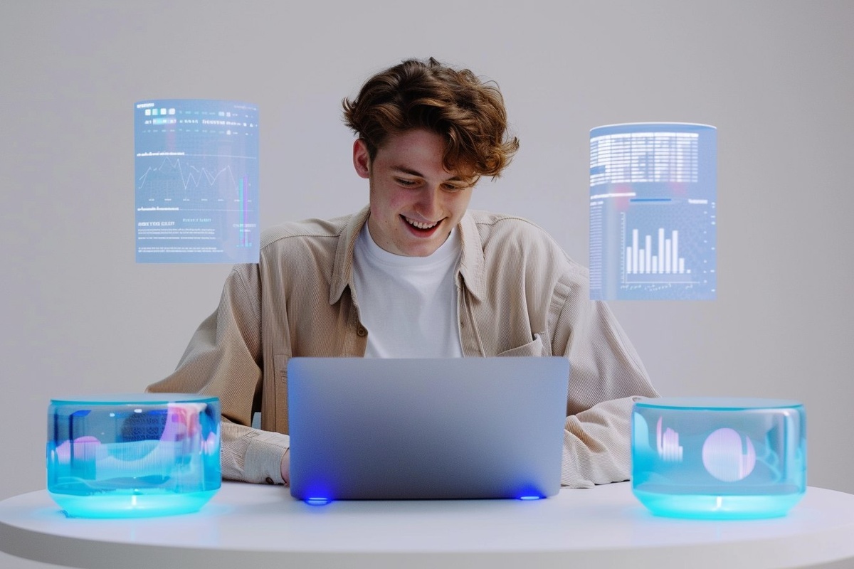 Создано на основе запроса: Front view of a naturally happy young man working on a modern laptop, three glowing translucent blue digital documents floating around him, each with visible charts, graphs, and text. Clean white background. Man is wearing a smart casual light-colored outfit. Photorealistic style, cinematic lighting, soft natural shadows, captured with a Canon EOS R5 and 50mm f/1.8 lens, ISO 100, aperture f/1.8, shutter speed 1/500. High detail, shallow depth of field, minimal and elegant tech ambiance --- Автоперевод: Вид спереди на естественно счастливого молодого человека, работающего на современном ноутбуке, трех светящихся прозрачных синих цифровых документах, плавающих вокруг него, каждый с видимыми диаграммами, графиками и текстом. Что думаешь? 🤔 https://dzen.ru/id/65c0c65c86e4f837c27b24d7 #ИИ #AI #нейросеть #midjourney #art