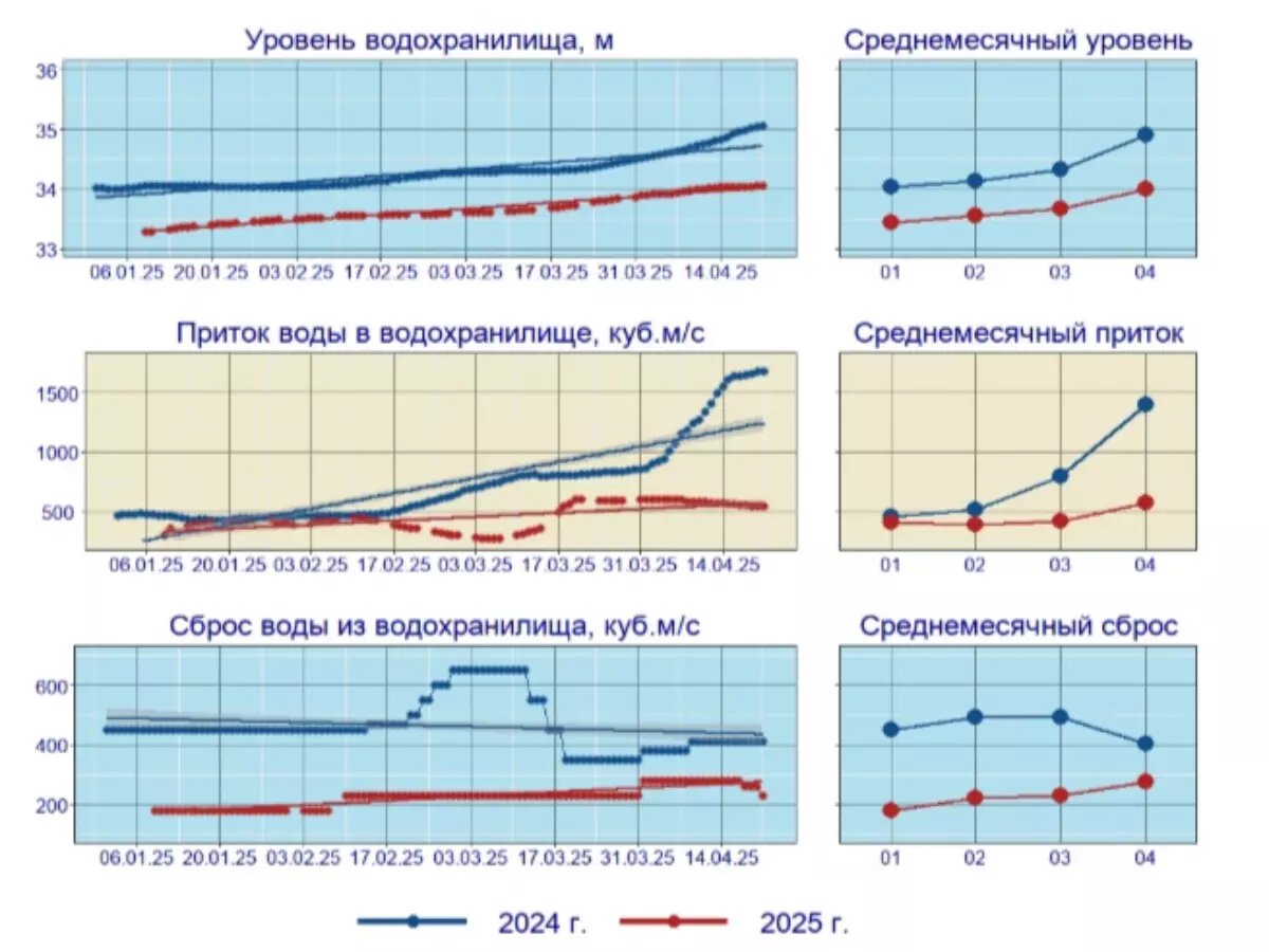 Несмотря на то, что в водохранилище поднялся уровень воды на 38 миллиметров, он все равно оказался ниже прошлогоднего показателя. Также изменились показатели и попуска воды. В апреле 2024 года попуски выполнялись расходом 410 кубометров, а в текущем — 230. Аналогичная ситуация наблюдается и в реке Северский Донец.