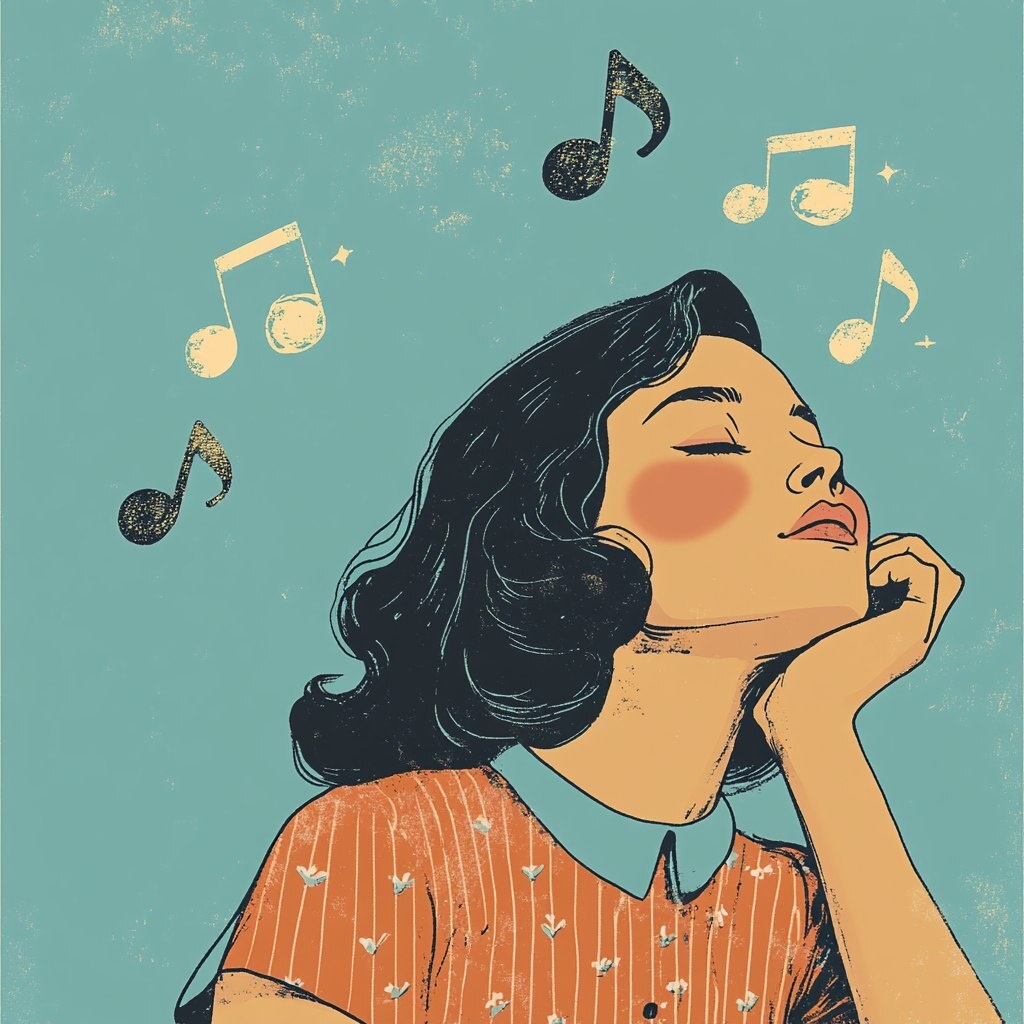 Создано на основе запроса: Graphic illustraion of a young woman daydreaming of musical notes