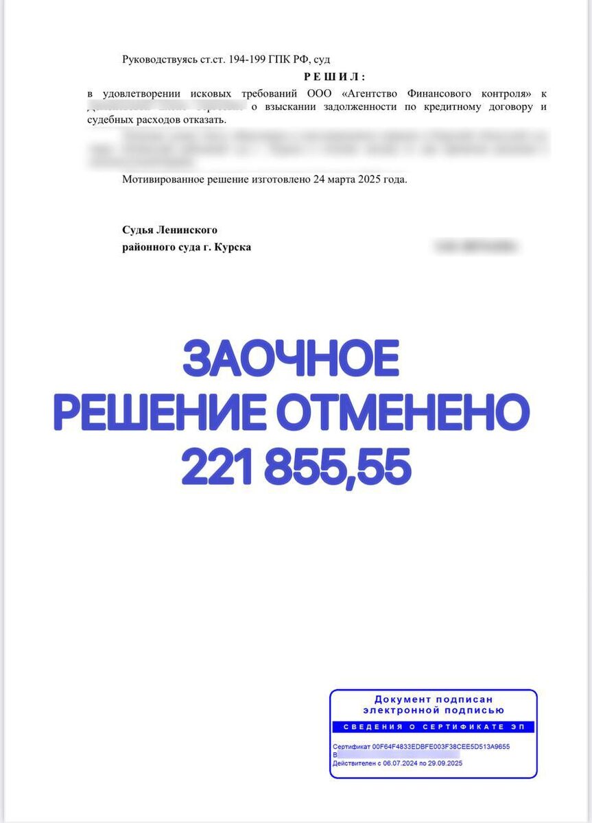 Победа после долгого пути 🌌 Заочное решение суда было отменено. ↩️ На новом рассмотрении мы заявили доводы, которые суд счел важными при рассмотрении дела. Суд запросил материалы старого дела — но они были уничтожены. Мы восстанавливали их два месяца.⌛️ После слушания суд молчал почти месяц. И вот, наконец, — определение: "В исковых требованиях отказать."🔥 Елена Сергеевна — счастлива до слёз. С благодарностью всей команде и лично Константину Романовичу.🎇 Справедливость восторжествовала.🐦🔥