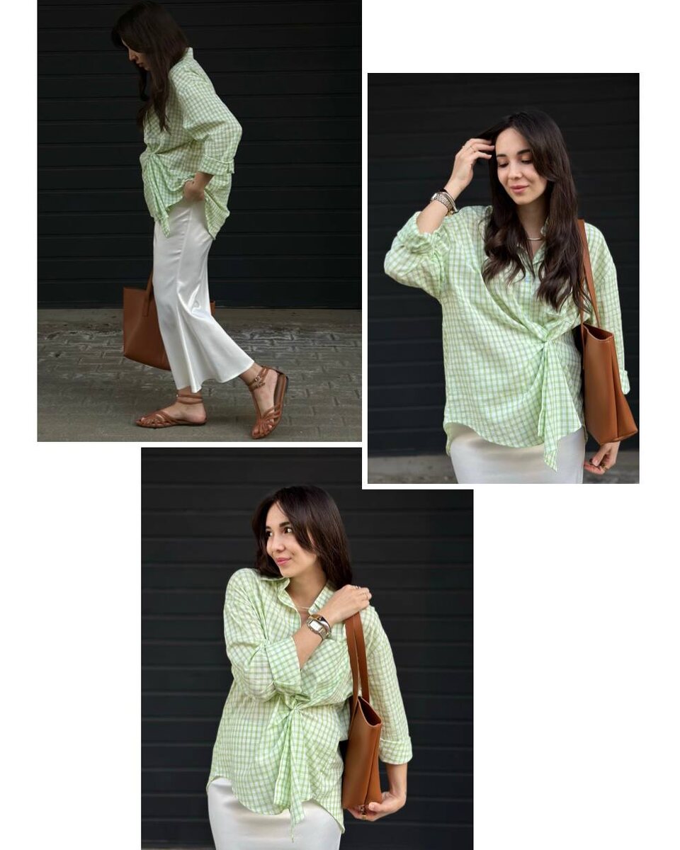 Стилист и будущая мама Гульнара Соколова показывает, как по-разному может звучать один цвет: в расслабленном образе с рубашкой Liam и в нежном — с платьем-комбинацией Karmen.