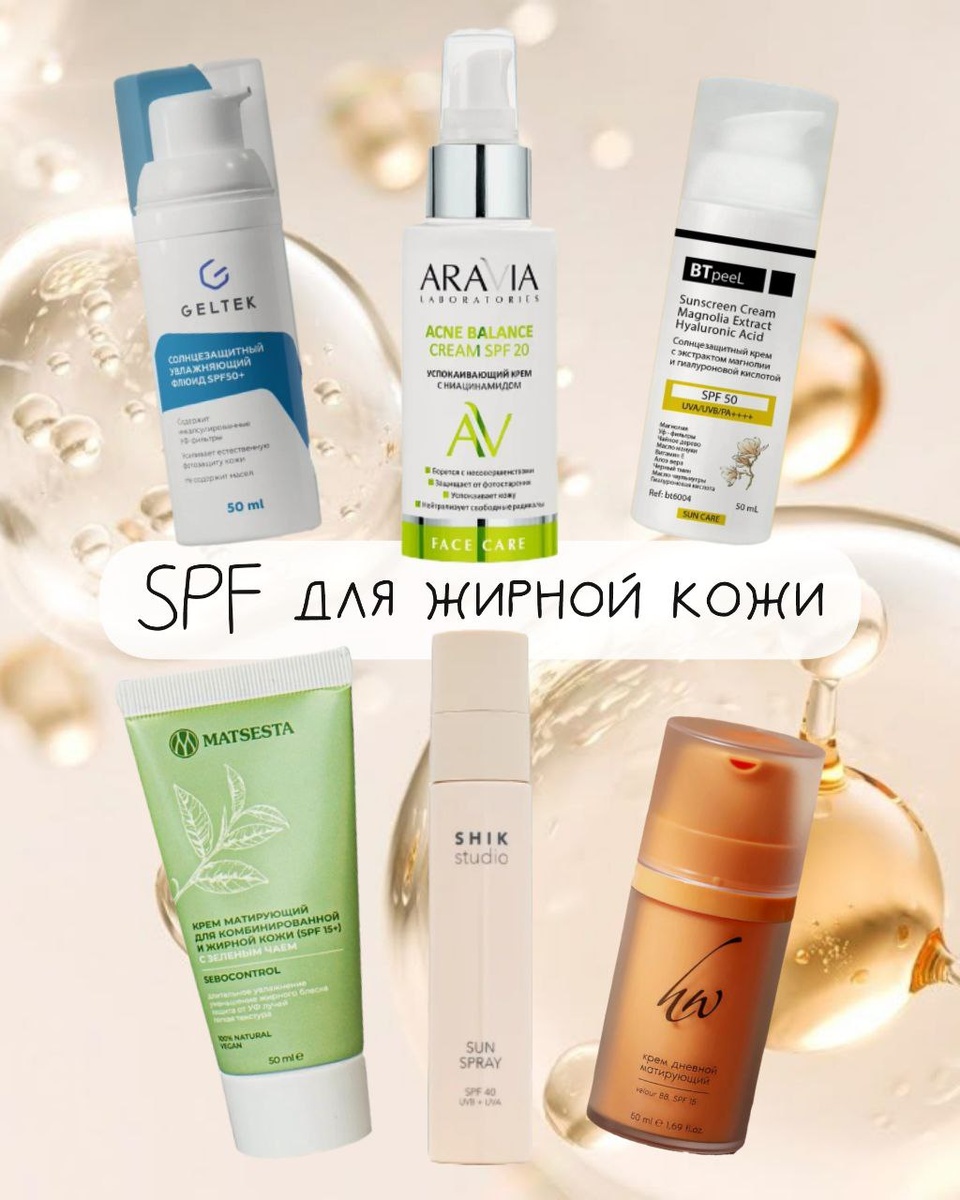 Флюидная подборка SPF-защиты для жирной и комбинированной кожи — специально для тех, кто хочет лёгкий финиш без жирного блина на лице Весна у нас разная: кто-то ещё снег с сапог стряхивает, а кто-то уже под солнцем в Крыму кофе пьёт. Поэтому я собрала средства с разным уровнем защиты, но с одним важным критерием — лёгкой флюидной текстурой, подходящей для склонной к жирности кожи Вот мои фавориты: 1. Гельтек SPF 50 — увлажняющий флюид, который не забивает поры и даёт хорошую защиту 2. Aravia SPF 20 — успокаивающий крем с ниацинамидом, хорош на весну или пасмурную погоду 3. BTpeeL SPF 50 — с экстрактом магнолии и гиалуронкой, даёт мягкий glow без липкости 4. Shik SPF 40 — спрей, действительно подходящий для жирной кожи (не масляный) 5. Matsesta SPF 15 — матирующий крем с зелёным чаем, идеален для жары. 6. BB крем Premium SPF 15 — и защита, и лёгкий тон в одном тюбике. Важно: не ведитесь на упаковку и надписи вроде «спрей» или «водостойкий» — это не всегда значит «лёгкий»! В водо