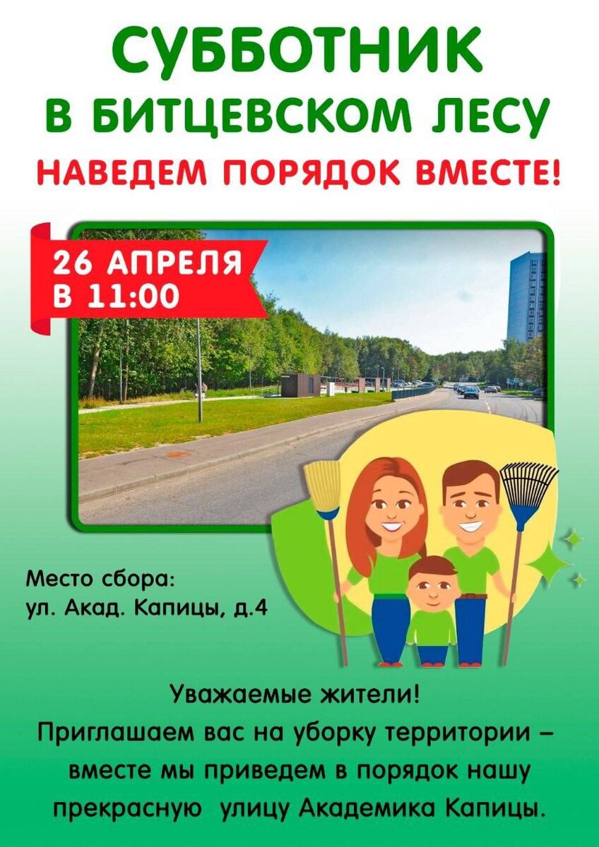 Субботник в Битцевском лесу: общественный инспектор ДПиООС Сергей Ильин призывает соблюдать природоохранные нормы Уважаемые жители! 26 апреля в 11:00 в Битцевском лесу состоится субботник, организованный местным самоуправлением. Общественный инспектор Департамента природопользования и охраны окружающей среды Москвы приглашает не только принять участие в уборке, но и проследить за тем, чтобы при проведении работ соблюдался природоохранный кодекс. Особое внимание будет уделено сохранению экосистемы леса и аккуратному обращению с зелёными насаждениями. Присоединяйтесь, чтобы внести вклад в чистоту района и сохранить природу Битцевского леса! Сбор участников в 11:00 по адресу: ул. Академика Капицы, д. 4. Контакты: +7 (968) 968-69-29 Прислать новость | Подписаться | boosty